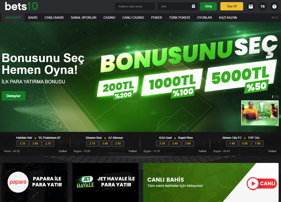 Bets10 bahisleri ile kazanmak için iki seçeneği kullanabilirsiniz. İlgi alanına gore değişik iki kategoriyi değerlendirebilirsiniz. Spor bahisleri bölümünde her gün 50 değişik spor dalını, aylık minimum 150.000 değişik karşılaşmayı kullanabilirsiniz. Spor bahisleri bölümünde, ulusal ya da internasyonal karşılaşmaları tercih edebilirsiniz, yarış seçeneklerini tercih edebilirsiniz. Canlı bahisler bölümünde günlük minimum 15 değişik spor dalını ve aylık minimum 60.000 değişik etkinliği kullanabilirsiniz. Spor bahisleri bölümünde yüksek bahis oranı alacak, canlı bahisler bölümünde yüksek bahis oranı alacaksınız. Tüm bahis seçeneklerine, istatistiksel veriler ile destek sağlandığını görmüş olacaksınız. Canlı bahislere, istatistiksel veriler haricinde, bets10 TV üstünden canlı maç izle özelliği ile destek sağlandığını görmüş olacaksınız.